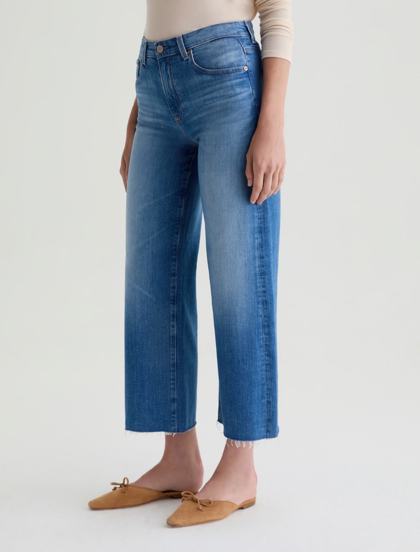 The Saige Wide-Leg Crop is a mid-rise jean crafted from comfort-stretch denim. Designed to sit comfortably at the waist, this AG-ed™ denim has vintage raw hems and an AG-ed wash that replicates 13 years of natural wear, making it a versatile choice, especially for petite proportions. Crafted from premium denim sourced from Italy’s Candiani Mill.