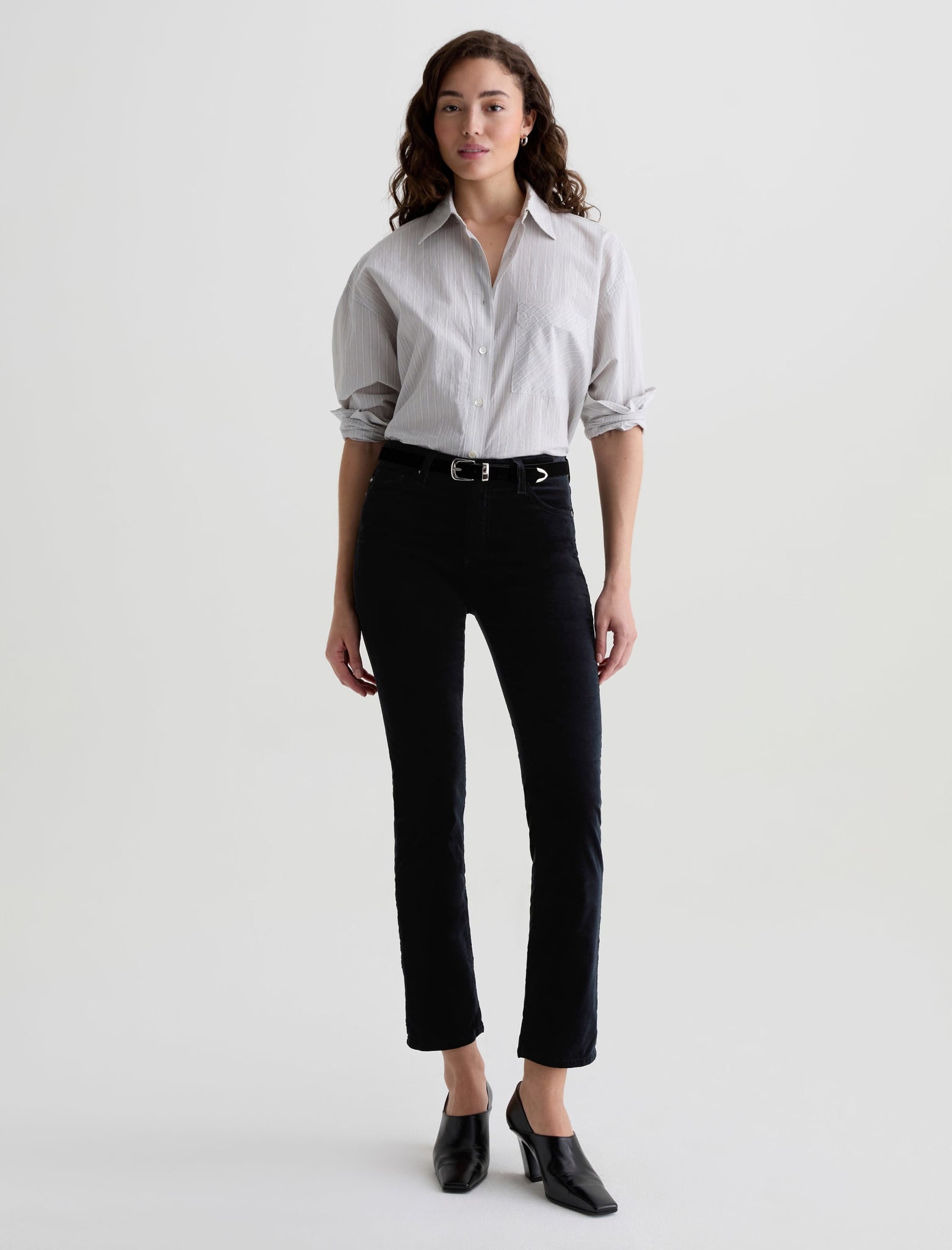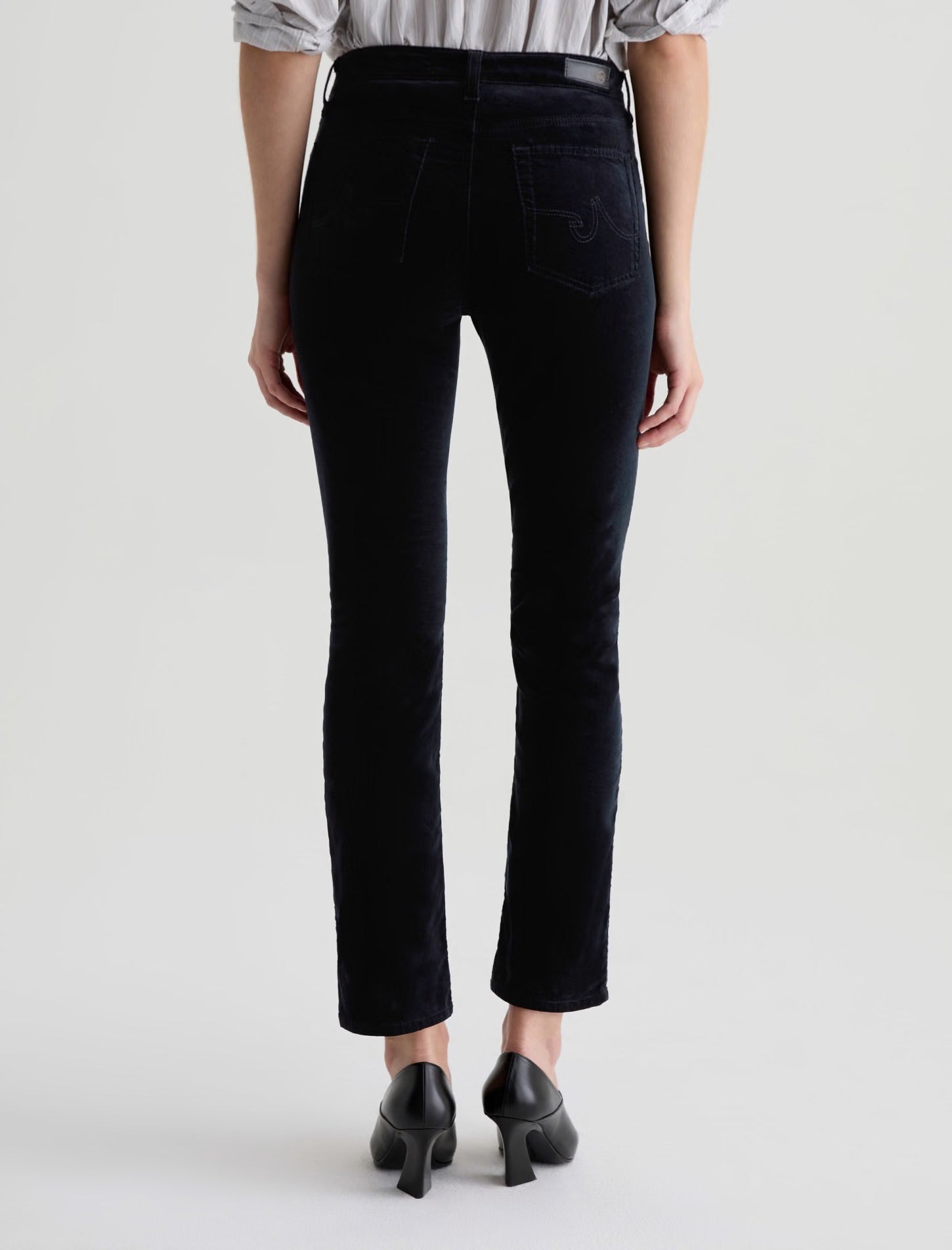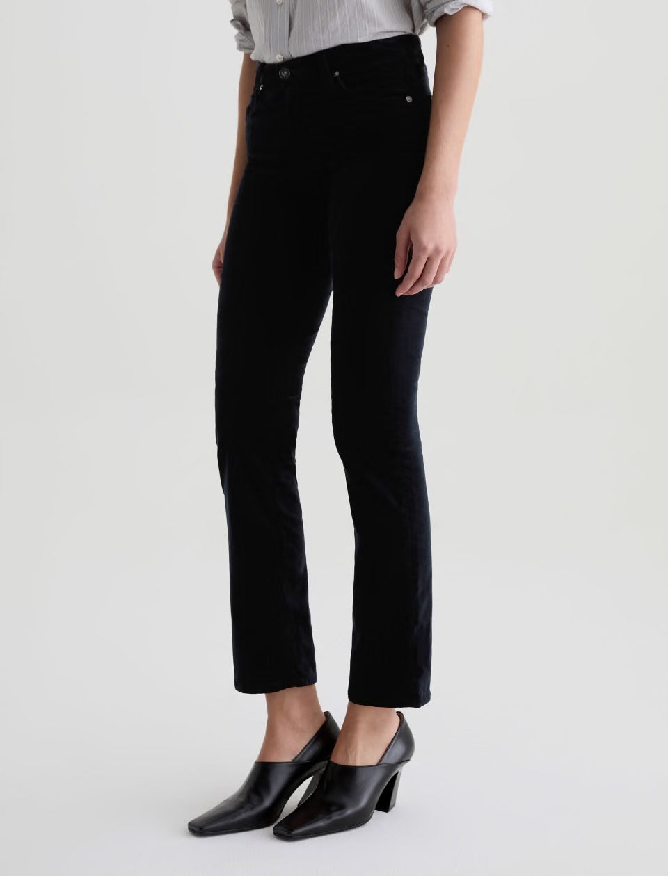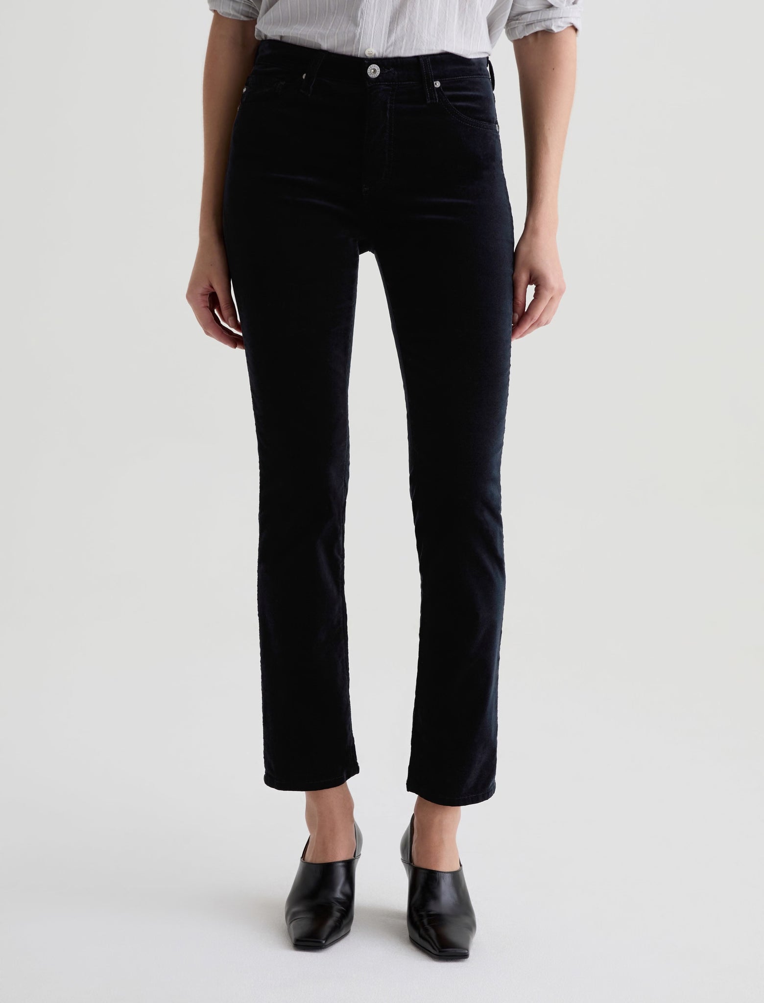 The Mari Velvet is a mid-rise slim straight pant cut to flatter with clean, elongating lines. Features an easy fit around the hips with a straight silhouette that tapers just the right amount. Crafted from Soft Plush Stretch Velvet, 8 oz. Rayon for premium comfort and style. Shown here in super black.