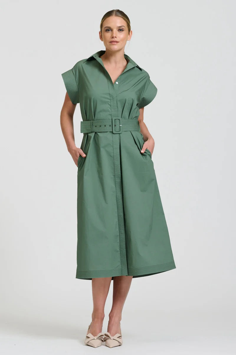 Fabulous Fifi, a gorgeous new silhouette, midi length, feature over stitched cap sleeves, placket and belt. Dress her up or dress her down, she's sophisticated and stylish. Crafted from 100% cotton.