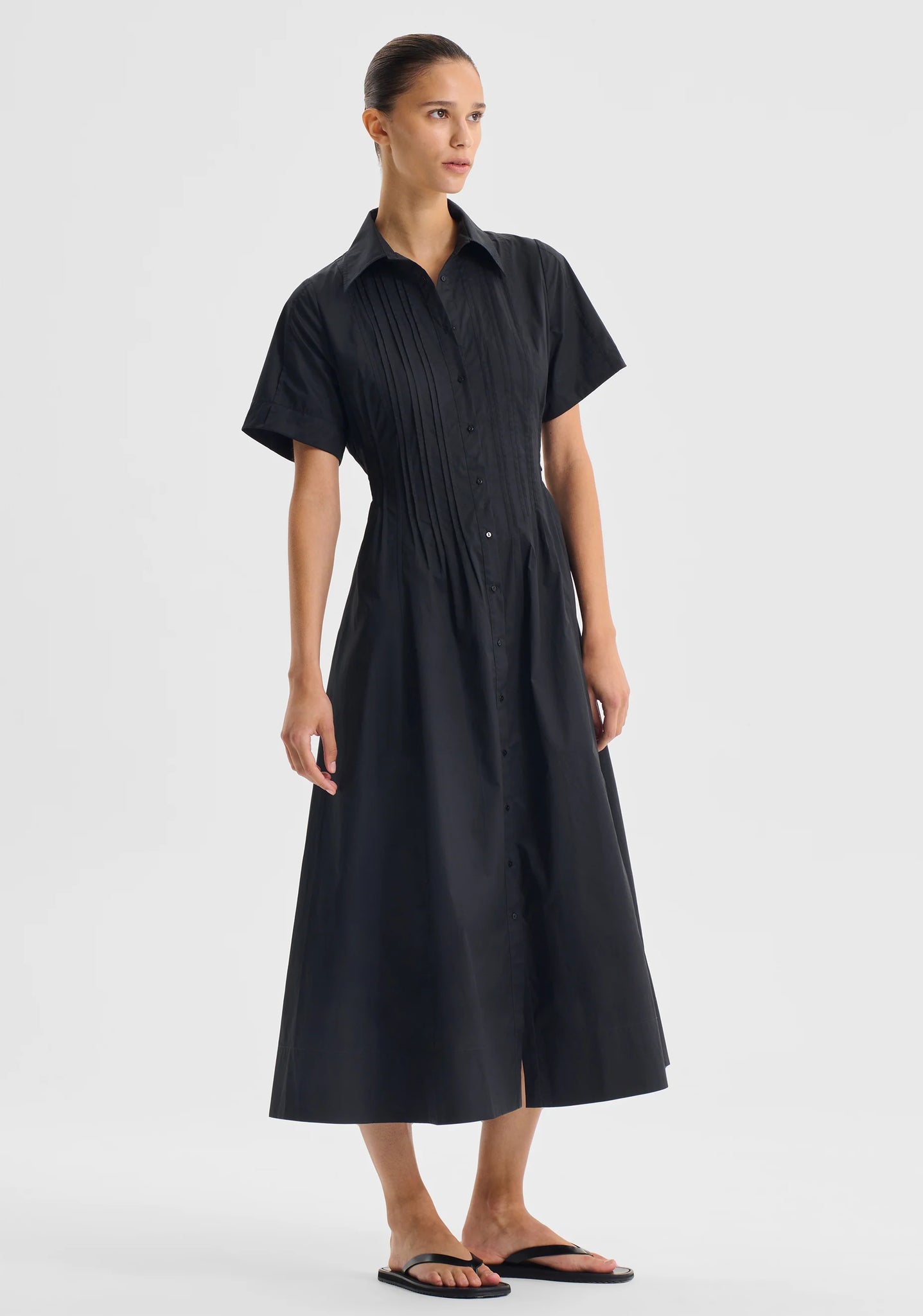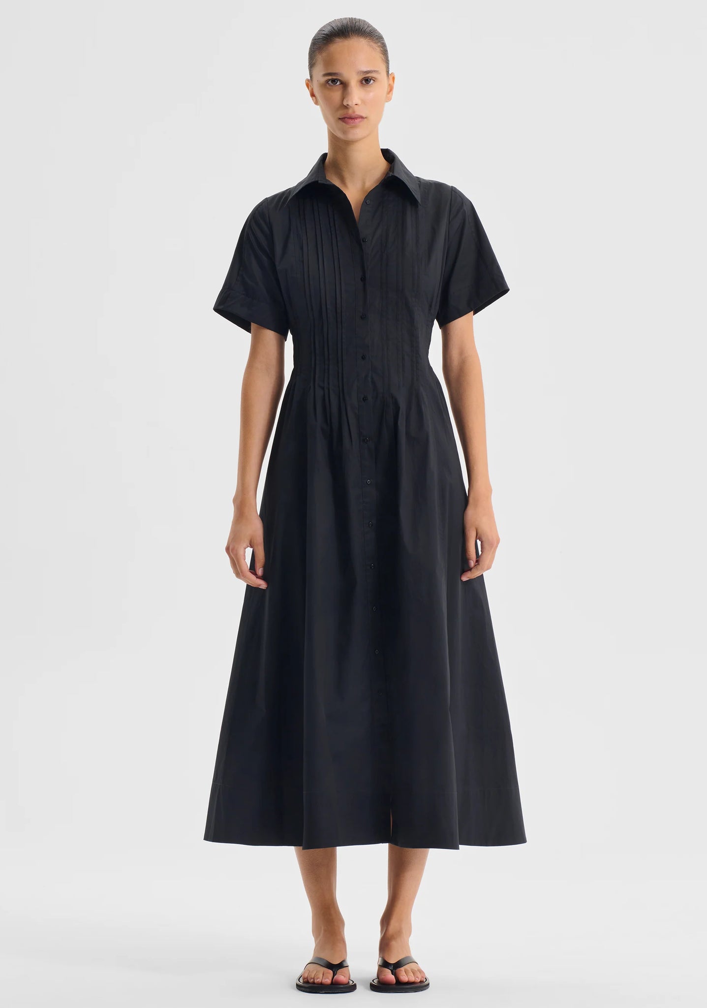 Crafted from mid-weight cotton poplin, the Arabella Dress features a traditional collar, button front placket, and short sleeves with wide cuffs. Thoughtful pintucking at the waist creates a flattering shaped silhouette, complemented by side seam pockets and a flared midi-length skirt.