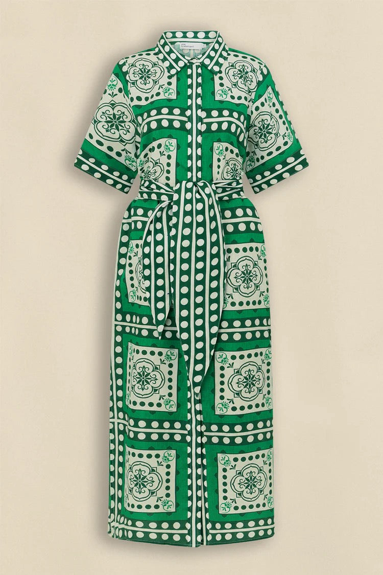 sustainably printed our exclusive parrot scarf print, a spirited exploration of hue and european-inspired graphic motif. the roam dress is perfect for resort styling or everyday luxury.