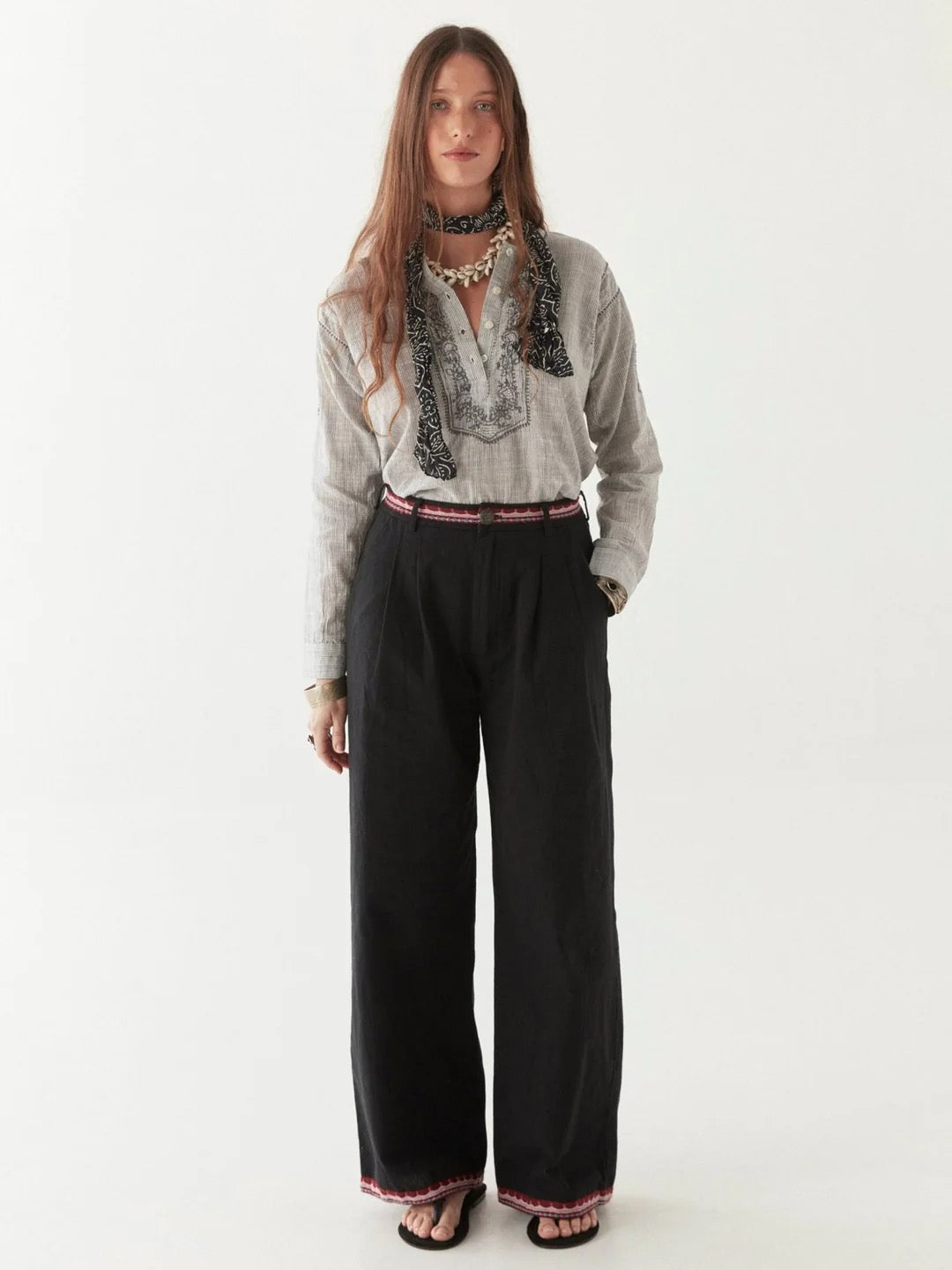 The fine blue pinstripes add a subtle vintage touch, while the delicate embroidered details along the neckline, front placket, and sleeves elevate its artisanal appeal.
