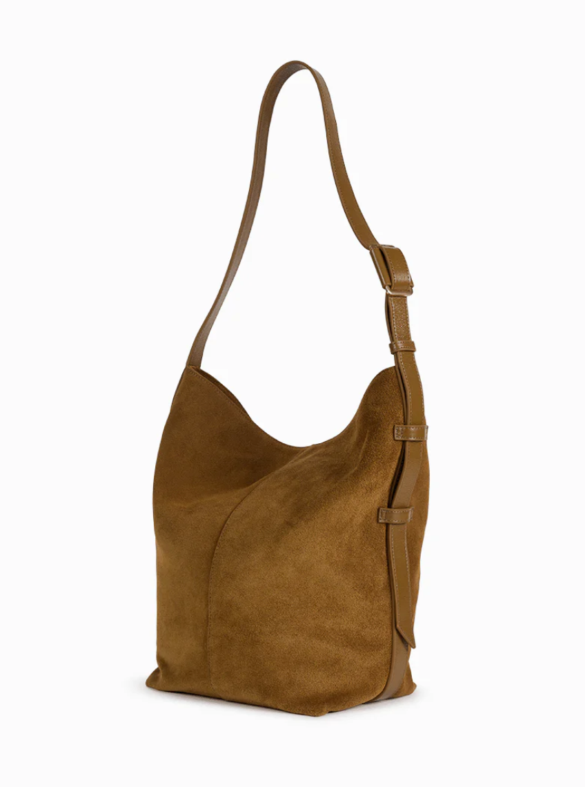 The Nour bucket bag boasts a sleek and stylish silhouette in a practical XL size. Worn over the shoulder with an adjustable strap, it closes easily thanks to its magnetic closure. Inside, its zippered pocket, slip pocket, card holder, and removable base offer well-organized storage for everyday essentials.