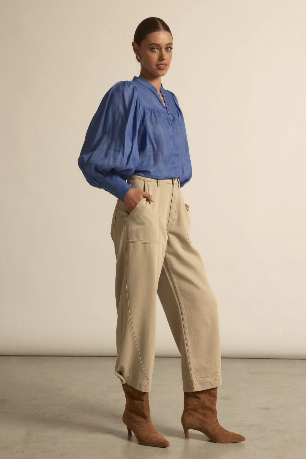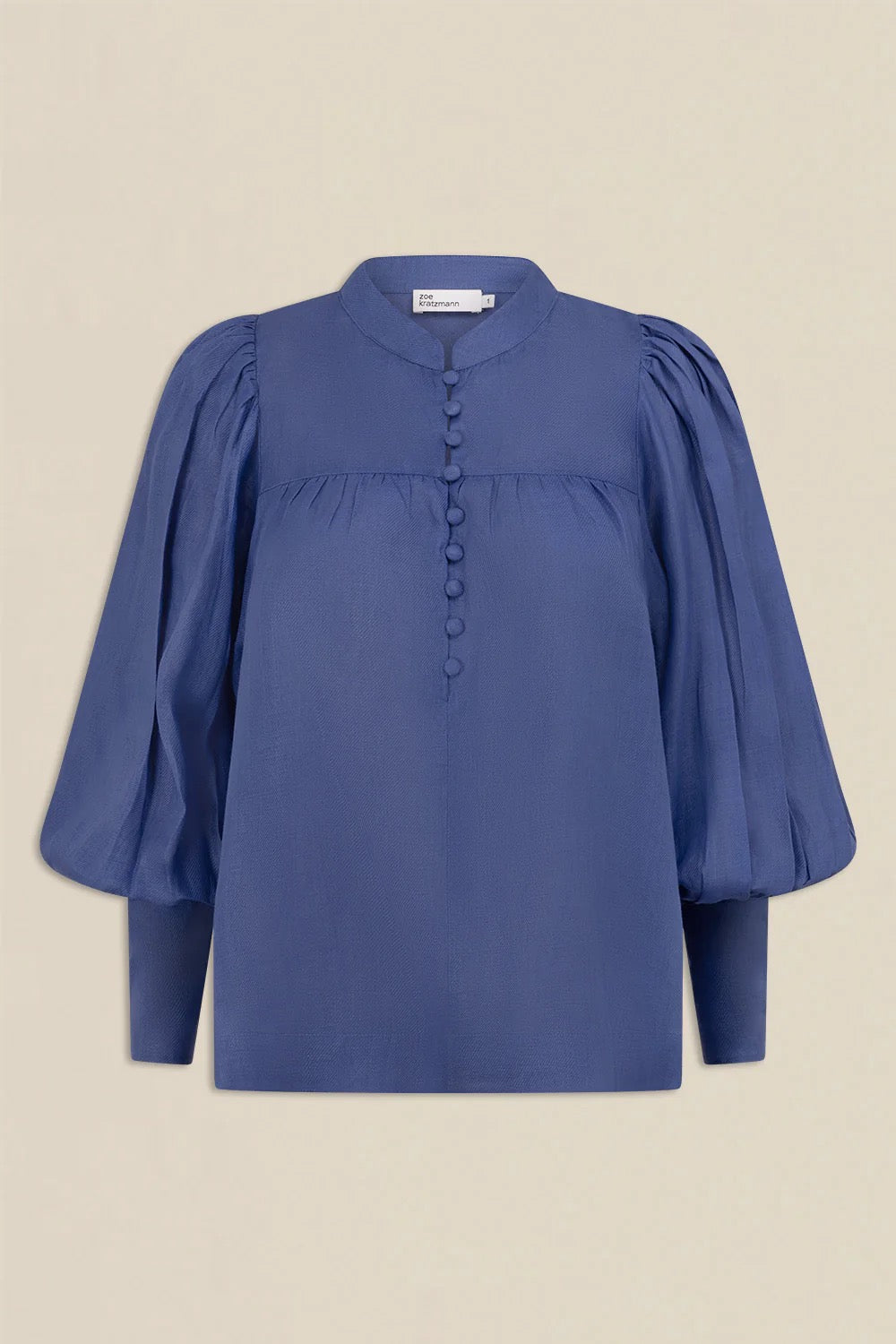 - blouson sleeves finished with a deep cuff for sculptural shape