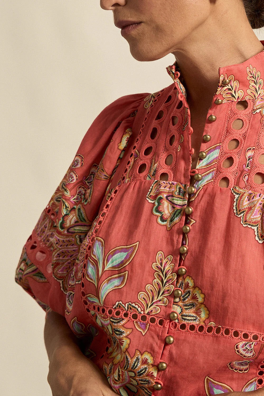 circular lace trims and antique brass buttons deliver romantic appeal in a silhouette that works for every day.